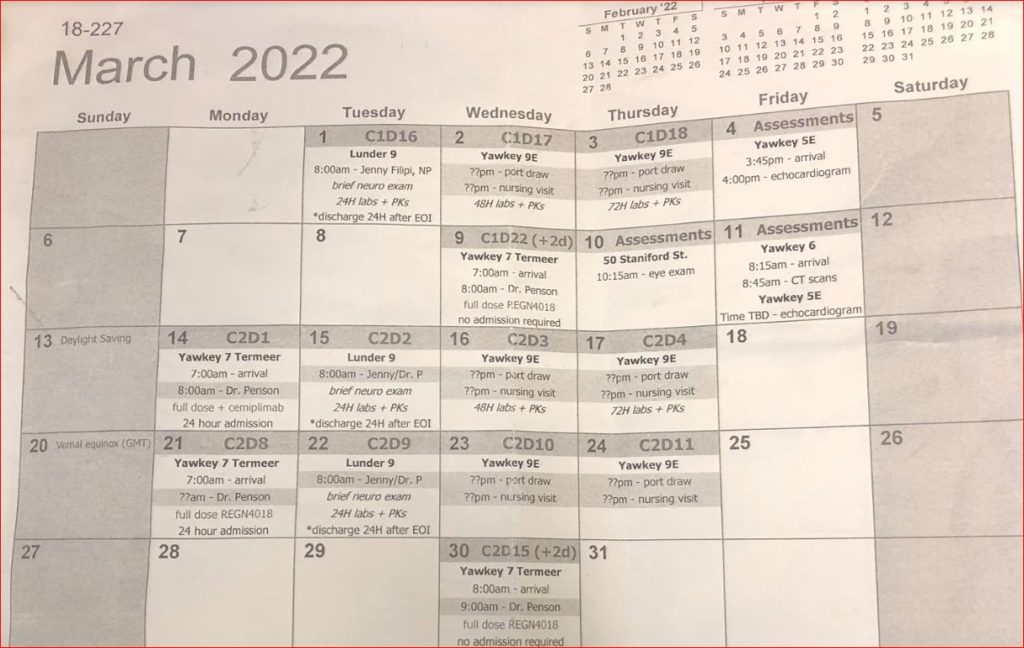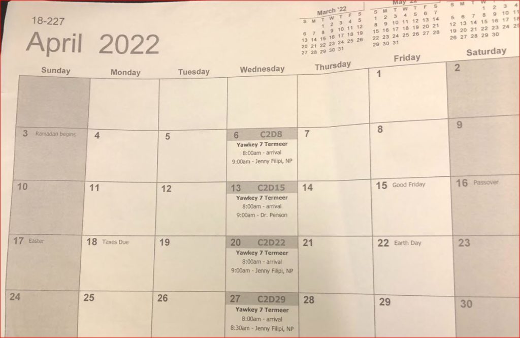 It’s April 13th and I started this trial 2 months ago. To get an idea of how different my life and schedule in April is, compared to March (and March), just look at these two appointment schedules below. This isn’t my regular calendar it’s my calendar for medical appointments as Mass General and doesn’t even include the unplanned visits (like for removing the PleurX and getting a blood transfusion).